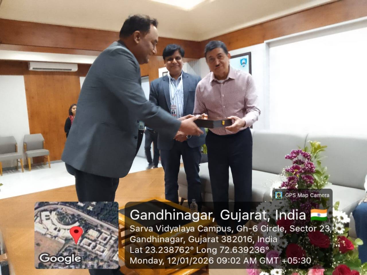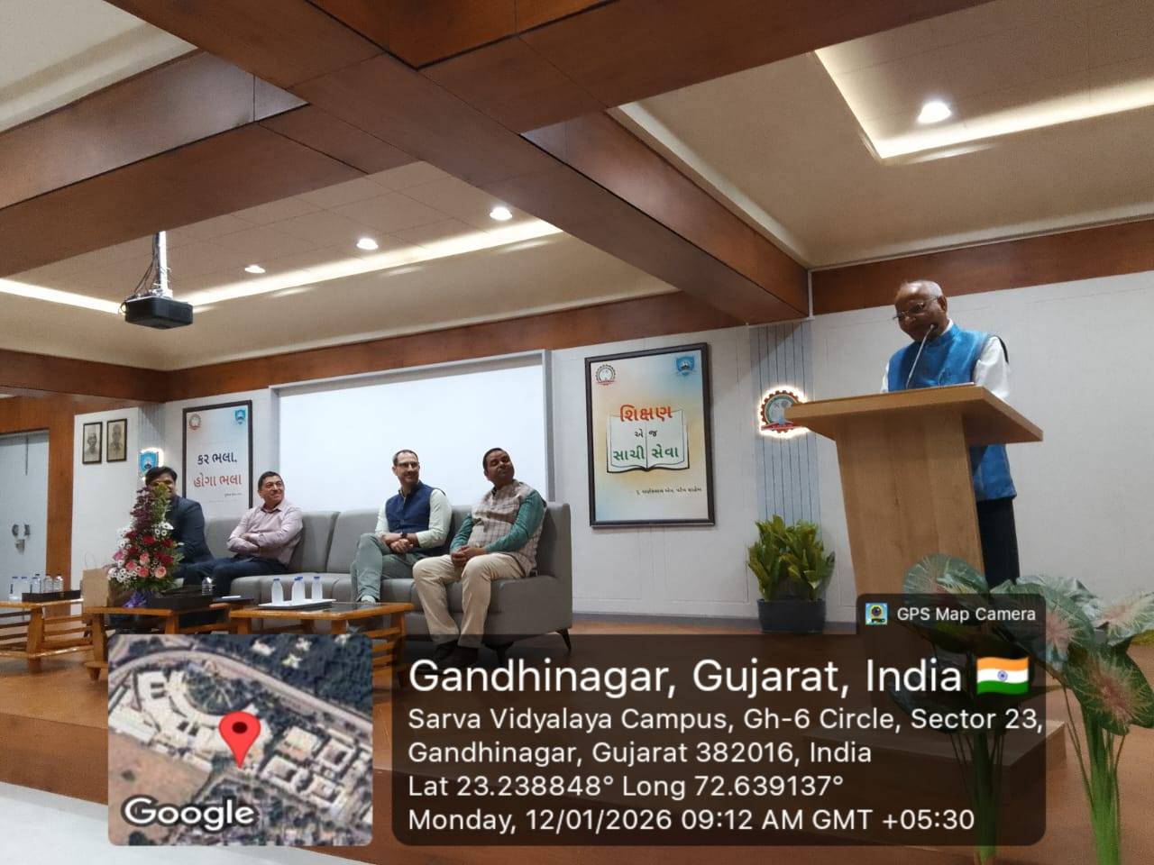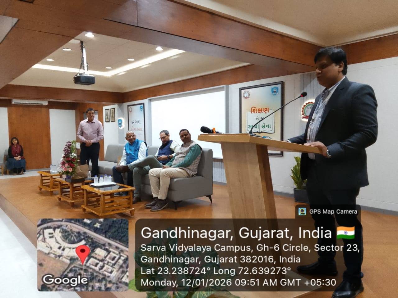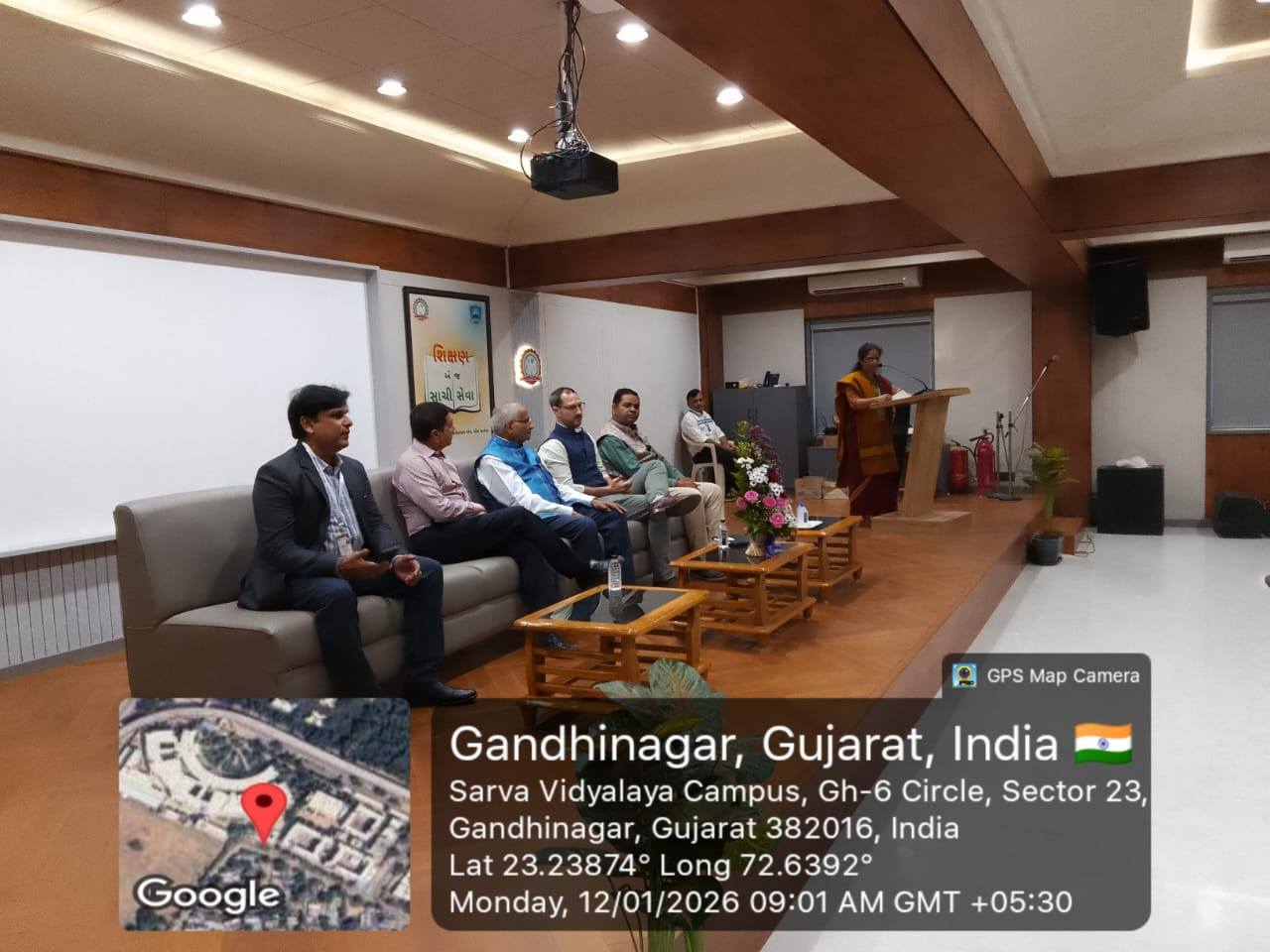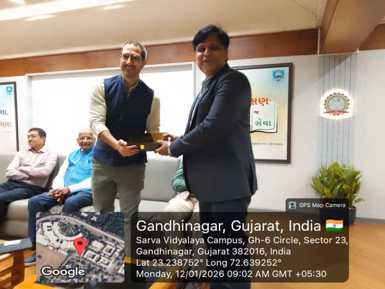 On the morning of the 12th of January 2026, the students of the constituent colleges of Kadi Sarva Vishwavidyalaya had an opportunity to interact with Mr. Christopher Turillo, Co-Founder, Medha, a non-profit organization based in India that has helped over 200,000 youth start rewarding careers of their choice. He was accompanied by Dr. Chittaranjan bhai Patel, a distinguished medical professional based in Chicago, Illinois, who has been the much honored and applauded guest of the university for a long time. Mr. Turillo interacted with the students about his own journey of working with the youth, as a professional and as a mentor. He narrated at length how the career of one’s choice is based on certain personal qualities as an individual as well, in addition to the formal accomplishments for the same. He asked questions about the future aspirations of the students and opened up the quite enriching discussion on what are the challenges that the students might be facing in this, and their probable solutions. In a very friendly yet gently guiding tone he answered all the questions asked by students regarding how to choose the right career. Dr. Jay Patel, who too accompanied the duo, shared his thoughts and vision of the future careers and their pre-requisites. He expressed his wish to interact with the students through some more sessions in the times to come. The program was coordinated by the Department of International Relations, SVKM. Dr. Hiren Patel, Principal- Vidush Somany Institute of Technology and Research, KSV and Dr. Bhavin Pandya- Dean, faculty of Management, KSV remained present and accompanied the guests throughout the session. The never-ending questions from the side of the students and the elaborate answers by Mr. Christopher Turillo marked the session as a highly fruitful and enriching experience for all.