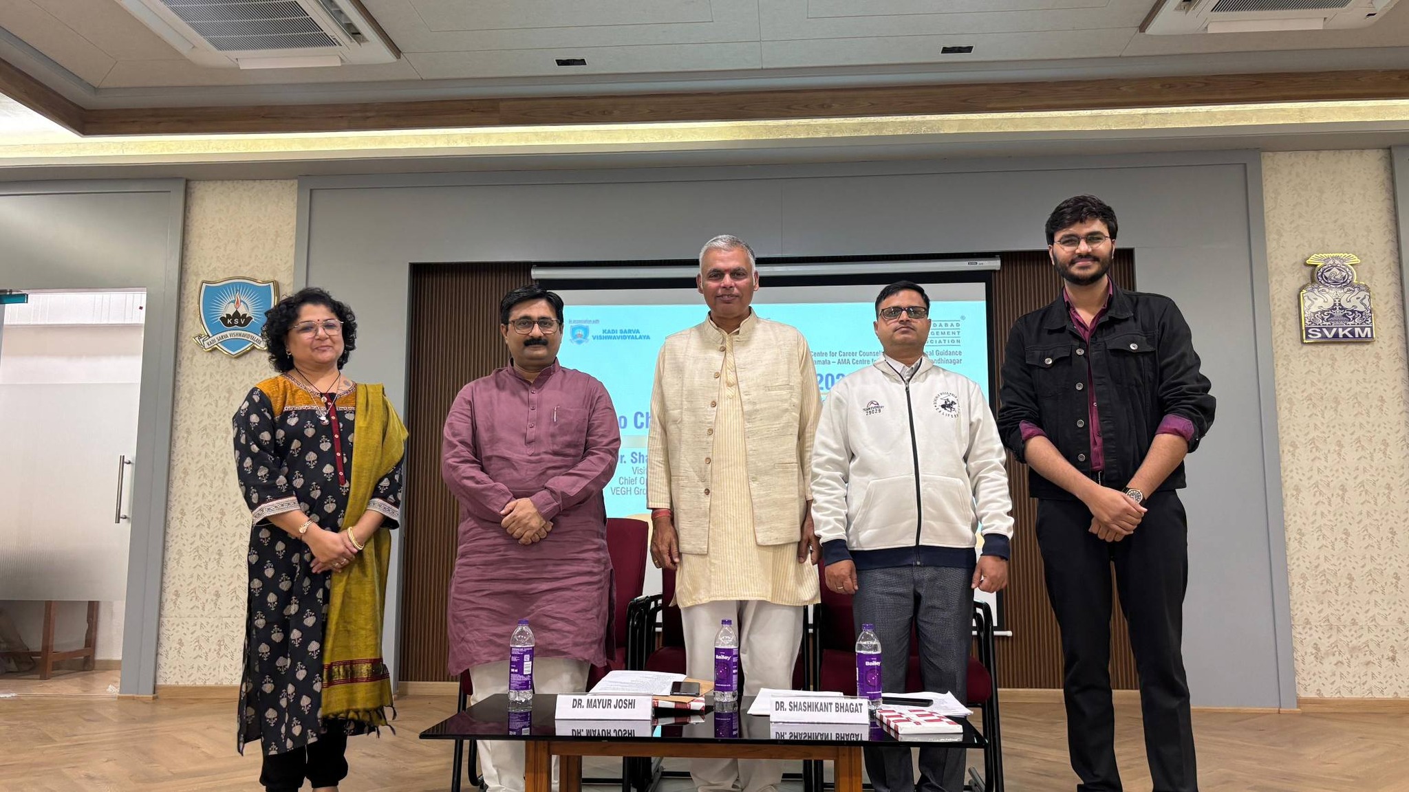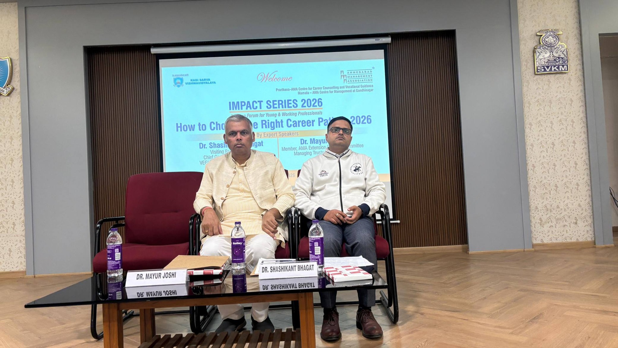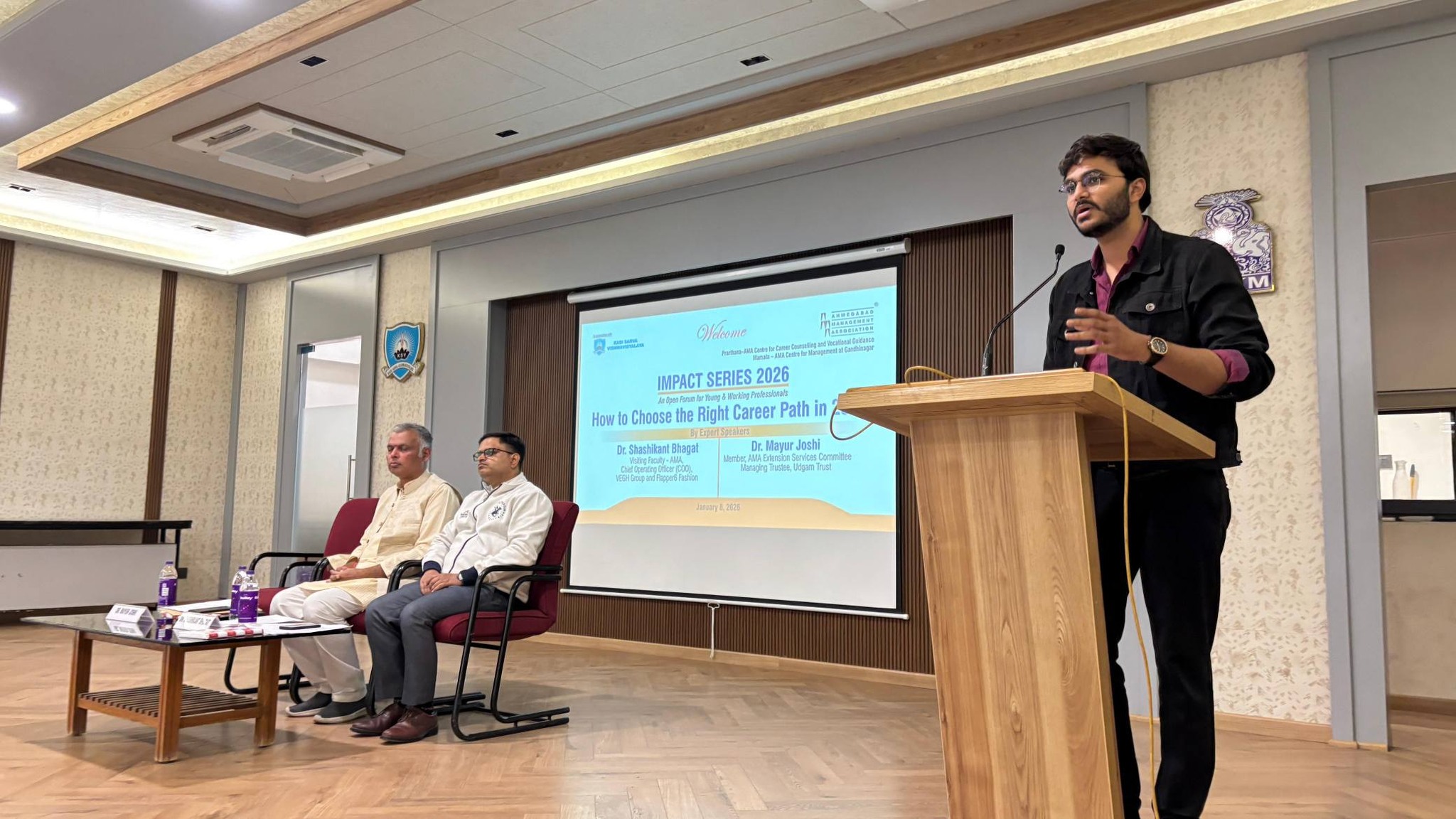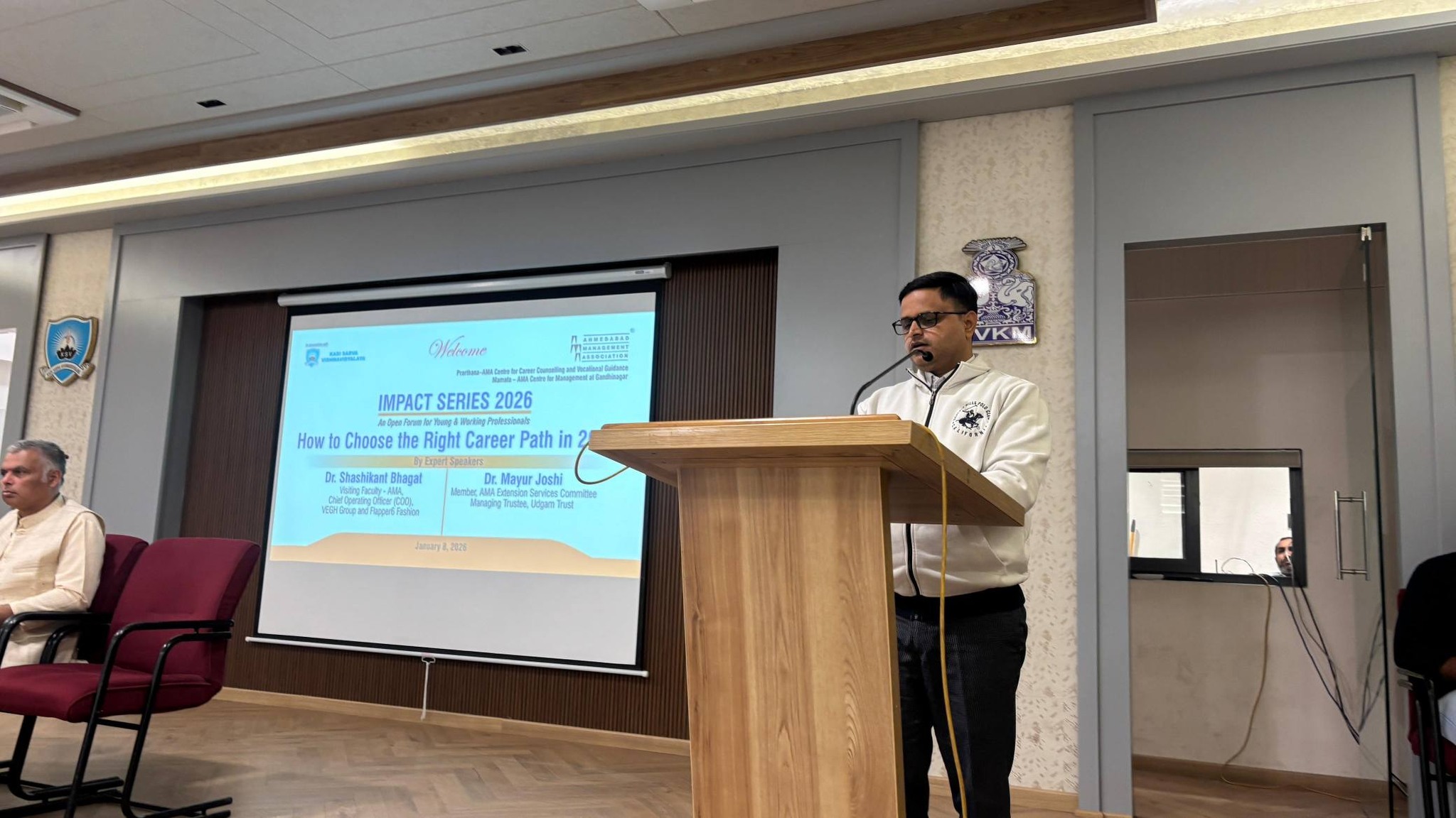 The Impact Series 2026 session on "How to Choose the Right Career Path in 2026” Was jointly organized by Kadi Sarva Vishwavidyalaya and Ahmedabad Management Association on January 8th, 2026 at Brahmani Krupa Hall, KSV campus, Sector 23, Gandhinagar. The session featured two speakers: Dr. Shashikant Bhagat The COO of VEGH Group and President of the Public Relations Council of India, former Head of Journalism and Liberal Arts at Swarnim University, opened the discussion referring to the larger vision of interdisciplinary approach to Education and the role of New Education Policy in implementing that. He talked about future careers in terms of this vision. Dr. Mayur Joshi With nearly 30 years of dedicated service to society as a visionary for the upliftment of the deprived ones, Dr. Mayur Joshi, the Managing Trustee and Founder of Udgam Charitable Trust, discussed the career options with his unique philanthropic point of view connecting it with the modern day. The session proved to be highly interactive with the presence of academicians as well as students along with the other participants. The welcome address and vote of thanks were presented by Ahmedabad Management Association, and all the arrangements were looked after by KSV.