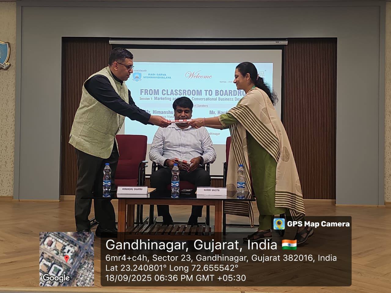 Kadi Sarva Vishwavidyalaya in collaboration with the Ahmedabad Management Association hosted the second Open Forum Session on From Classroom to Boardroom on 18th of September 2025, in the Brahmani Krupa Hall at the KSV campus of Sector 23, Gandhinagar. The sessions opened with the introduction of guests, Mr. Himanshu Sharma, Versatile Healthcare Business Leader, International Business Expert and Mr. Hardik Shastri Regional Head SME Lending & UBL Business for Gujarat, MP & Chhattisgarh presented by Ahmedabad Management Association. Welcoming the guests and felicitation was done by KSV.