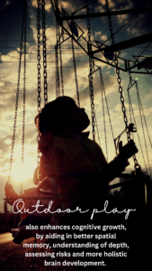 Outdoor play also enhances cognitive growth, by aiding in better spatial memory, understanding of depth, assessing risks, and more holistic brain development.